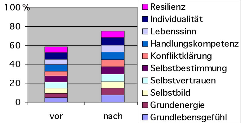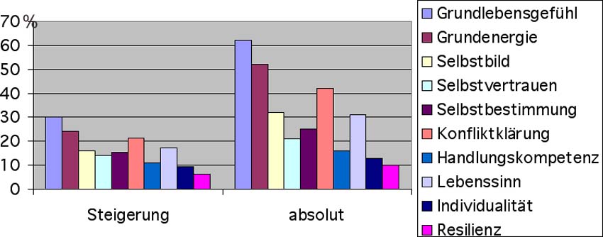 Die Steigerung des Grundlebensgefühls, der Grundenergie und der Konfliktklärungskompetenz stieg besonders auffällig. Ein synergetisches Selbsterfahrungserlebnis in der Gruppe erhöht somit sehr auffällig die eigene Lebensenergie, die Handlungskompetenz und damit die Kohärenz zum eigenen Leben und somit die Lebenskompetenz. |