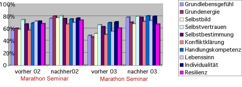 Auch im Vergleich zum Marathon Seminar im Jahre 2002 mit 28 Teilnehmern war das Marathon Seminar 2003 wieder ein voller Erfolg. Alle Werte wurden vor Beginn des Seminars und am Ende des Seminar abgefragt. Es wurde der gleiche Fragebogen mit den 10 wichtigen Parametern abgefragt. Auffällig auch hier wieder die Grundwerte für das Grundlebensgefühl und die Grundenergie stiegen besonders kräftig an. Diese Seminatteilnehmer schätzten sich im Vergleich zur Vorjahresgruppe entweder relativ schlechter ein oder ihrer Ausgangswerte waren tatsächlich subjektiv niedriger. Der Durchschnittswerte aller Werte aller Teilnehmer stieg im Jahre 2002 von 63,7 % auf 76,1 %, also somit um 12,4 % Punkte - oder auf absolute Steigerung berechnet stiegt das Endergebnis um 19,5%. Die Marathon Teilnehmer 2003 erreichten einen etwas niedrigeren
